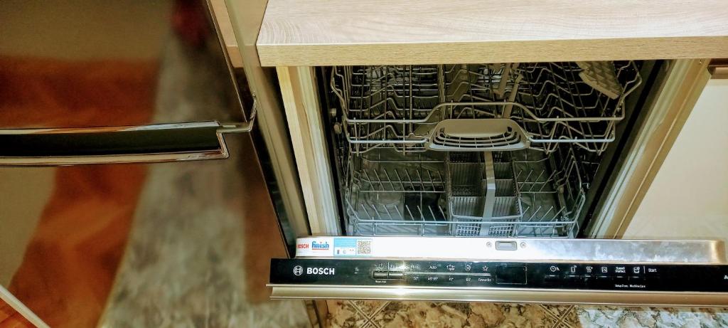 Kitchenette, Refrigerator, Washing machine, Kitchen, Kitchenware, Oven, Stovetop, Cleaning products, Dining table, Wine glasses